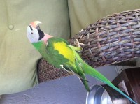 Riley is a Mustache Parrot and very friendly. Loves people and will fly to head or shoulder. He does not bite if you see him call his name and pat your shoulder. Will ride on head or finger as well. But you will have to hold him once you get him or he will fly again. Has never been outside. He is very afraid of inanimate objects.
