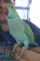 1 1/2 year old Indian ringneck, wings are not clipped, he does R2D2 noises and sexy whistle.