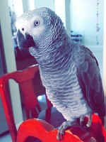 He speaks english and indian. He can be a little afraid if he doesn’t know you. But he loves saying things like drink water? , shreya, meena, fly, step up and he is just like any normal afircan grey parrot and he accidently flew out the back door and tried coming back but the wind picked up and he flew away and we found him in a tree after a couple hours but it was way too tall to get him down and he didnt know how to come down. So please just be on the look out for him, it would be greatly appreciated!!