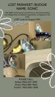 Sonic is a small blue, white, and black budgie. His belly is half white and half blue, he has a weird curly nail (his nails are long), and a yellow beak. He has a shy personality but will let you get close once he is tired or if you are gentle enough. Sonic understands Spanish and English, he also responds well to kissing noises and when you speak to him in a baby voice. He responds very well when you say his name as ‘sho-knee’ in a baby voice. He was last seen in the trees between two apartment complexes on Commercial and 6th Ave. The Embarcadero and The Village at Oakland Park. He will respond to other budgie noises.