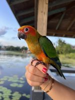 Can’t find our Sun Conure since about 6:30 pm Saturday evening (Aug 6, 2022). Was last seen hanging out on the perch on top of his cage in our screen covered backyard. Can’t seem to figure out how he escaped.