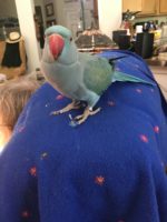 She is aqua with some lime green on her wings. Willow is robin size but more slender with a very long tail. She is tame but don’t know if she will “step up” for strangers. Her favorite treats are cashews and bananas. Please call 772-807-1832 or email “cookie9862@me.com” if you see her.