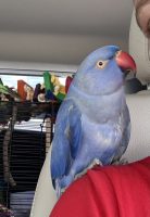 Violet Indian Ringneck spooked and flew off near Sunrise and A1A 9 pm Sunday. Is probably in a tree in the neighborhood or along A1A. Light blue grey with red beak and growing a black ring around his neck. Will seek out people but will fly off if you get too close. He talks, makes kissing noises and other sounds that are distinct from wild birds.