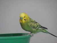Seymore is a large parakeet with a green body and yellow head. He is a male parakeet with a blue cere. His feathers are not clipped. He will perch on a finger when instructed to do so. He likes to sing and whistle. He was last seen flying north on Banyan Lane