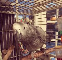 Cleo is approximately 20 years old. She has a noticeable wonky wing (sticks out away from her body) from an old injury, so she is flightless. She prefers men over women. She doesn’t talk a whole lot. She’ll say my son name “Kristian” and she’ll mimic my husband talking, and sometimes will say “Hey girls”. She loves to make fart noises and the sound of trucks backing up.