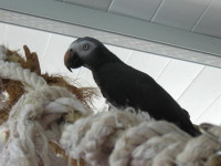 Bobbie is a small Timneh, runt of the batch, shy, spooks easily, bites very well. Talks a lot when no one is listening or paying attention to her. She is very close to her Brother Tony. I hand raised her and her brother. She is clipped but has 2 flight feathers that have grown in. She loves to have her head rubbed and will cuddle if she trusts you. She would rather walk than fly, other than today she she flew out the lani went up came down then went up again, lost track of here by Albee Farm Road and US41. She doesn’t have any strange marking other than being so small.