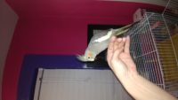 Female Cockatiel. About 2 years old. Size 32-33 cm. Has a band on right leg. Bold stick on top of head. Few yellow marks on back of head.