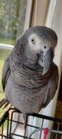 Very smart. Seven years old. First time she has gotten away. Not very good at flying. Very talkative. Has red tail