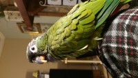 Pico is green with red tail feathers. He also has purple chest feathers.