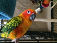 Flew away from Hamilton Landing in St. Simons Island this afternoon. She’s a Sun Conure, mid-sized with an orange and yellow body and green wings. She chirps very loudly, and answers to the name Peaches.