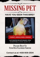 He’s got a white/grey head with orange and yellow cheeks, he is friendly. He enjoys burrowing into soft places to feel safe, and he’s been around other birds before.