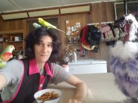 Boo is a friendly yellow pied mutation, he’s a boy, his cere is bright blue and he will most likely be in the company of a blue and white female budgie. She has a blue band, they are a bonded pair and escaped together. One of his tail feathers is slightly bent.