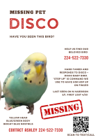 Has super dark blue/teal feather in tail. Band came off and was not replaced yet. Has a “playlist” of songs and sayings. “Salt n Pepa push it” , dipidoos , R2-D2 sounds, hand tamed- does “step up”