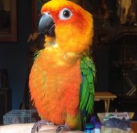 He is 3 years old. He is very friendly. He says hello and blows kisses and many other things. He loves bananas. He has a green tail with blue at the tip, blue and green wings, and as you can see in the photo an orange yellow body. He’s terrified. He was in the tree in front of my house for a couple hours before getting scared and flying away. Please if anyone sees him call (773) 724-1447. He was a member of the family
