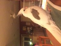 White cockatiel with gray on his wings. Friendly, peaceful fellow. Loves to eat our food and be with us.