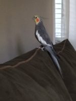 Angel is gray, with a yellow head, and orange over his ears. He very sweet, but scares easily. He loves and responds well to the sound of whistling and music.