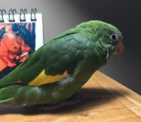 Adi is a white-winged brotogeris parrot. He is olive with a splash of yellow. He also has white feathers that make up his wing-span. He turned 4 years old on May 13th. He will fly to you if you call his name. His wings are not clipped. He is very tame and will “step up” if you ask him to.