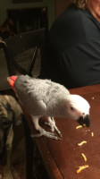 She has an all grey body with red tail feathers and a black beak. She is not a big talker. Whistles and makes noises a lot. Might say step up. Knows her name well. Is skittish around new people.