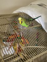 Yuki is a male green and yellow English budgie his ankle band is a maroon color ecacped Oct 9