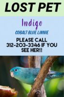 Indigo is an 8 year old Turquoise linnie and is very friendly. She has a blue band on her leg.