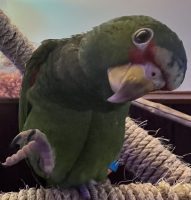 Riddler is a 3 and a half month old bird. He has red flight feathers and red tail feathers amongst his green plumage. He has yellow and white on his forehead, and makes a squeaky noise. His blue ID band is on his left leg PSxxxx. Owner will supply complete band number information. He is hand raised, so very people friendly.