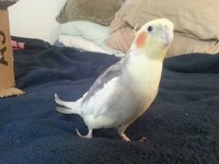 Grey and white body and wings with yellow head and orange cheeks. LuLu is 10 years old. He sings and can say his name. He is a very dear and precious friend to me.