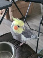 Normal gray split pied cocaktiel. Yellow face with gray patch on back of head. Mimics kissy noises and “good boy” and many other things he hears. Owner can provide numerous pictures of bird.