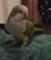 Quaker. Green with gray breast. Blue wing tips. Wings not clipped. Tamed and friendly.