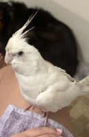 Very friendly. Feathers above beak are slightly grey in color. Does not speak words, but will give “kisses,” screech, whistle, and sing