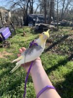 Small white and grey cockatiel with a yellow mowhawk and orange cheeks. Will whistle back. Loves crackers and sunflower seeds. Not a very good flier. Super sweet!! He is missed very very much!!
