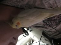 Female cockatiel about 1 year old. She is all yellow with large orange cheek circles. She does not respond to her name. She doesn’t talk only chirps.