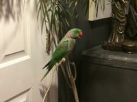 He is an Alexandrine parrot, He prefers women over men. he makes a high pitched and sharp squeaking sound, he also makes noises that resemble elmo. he does not talk often. he is an inexperienced flyer and often has trouble maintaing a straight path. he cannot fly very high. his tail is either growing in or it is crooked. he likes crispy or crunchy foods. and he is a picky eater. he is scared of dogs and may attempt to kiss your tongue or lips.