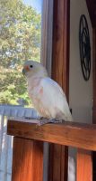 Goffin’s cockatoo. Mostly white. Has some chewed feathers. Is flighted. Got spooked and flew into trees nearby house. Nervous but friendly.