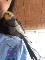 Mo is a normal gray, male cockatiel. He has yellow face and bright orange cheeks, gray body with white on wings. He’s very friendly and hand-tamed. He has a tiny cowlick in his gray chest feathers.