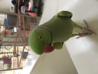 Indian ring neck parakeet. Make. Knows name and is a very good talker