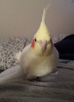 Very friendly, hand trained, answers with a high whistle, may come to you if called. LOVES TICKLES! Flew out the back door Jun 12 while attempting to follow Dad. Dad is her favorite person. She has a band that indicates she came from Florida. She may have some growing pin feathers under her other feathers around her neck where she loves pettings. Does not like overhand petting. She is full feathered. Sweet girl bird.   LOST SA, MA, Gloucester Lutino Cockatiel “Baby” June 12-15