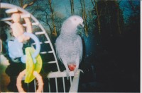 Hiawatha is missing a tow on one claw – it was bitten off by a Blue and Gold Macaw and never grew back. He whistles sharp pitched sounds, a “marching tune”, speaks in male, female and children’s voices. He barks like a small dog, and says “Joey” (my son’s name) and “Dolly” (my dog’s name) along with any number of other words and phrases he strings together.