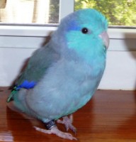 Bertie is a tiny blue bird, smaller than a parakeet, he is about 4″ TALL and weighs 28 ounces. He flew high up into the trees in our neighborhood and would not come down to his cage or perch. He is friendly and curious, likes millet and is crazy for Cheez-its which are bad for him but they are very good to lure him down.