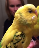 Sunshine is a bright yellow with a green bib around his neck. Friendly and has a vocabulary of over 100 words. Please see photo attached. Thank you!
