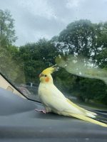 Is a 2 month old male baby cockatiel, (hatch date April 04 2024) friendly, hand-fed, tamed and un-clipped feathers. Has yellow spots on his wings. His is a bright yellow cockatiel,