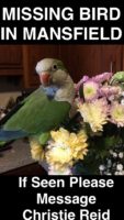 Brownie has been gone for 6 days now. He is a friendly Quaker, but cautious of people. He will go up to your forearm for a treat but is more comfortable landing on heads and making his way down. He likes children but seems to prefer 2-4 year old little girls. He is extremely loved, missed, and worried about. He does have a band beginning with HJV. We need him home with us, our house is not the same, and I miss my fresh boy more than words could describe