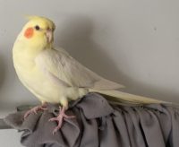 Bright yellow bird. Orange cheeks. Female lutino cockatiel “Barb”
