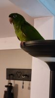 Approximately 4 years old. Speaks a lot. Says I love you, when you respond I love you too he says I know, Hi Guys, Hi Pogo, Good boy no bad boy, Go Mommy, repeats a laugh that sounds like a witch: Ah, Ha ha ha ha. Pogo is all green with a slight red band of feathers at his wings and where his beak meats his head.