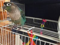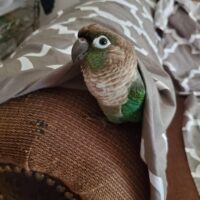 He’s a green-cheek conure, mostly green and turquoise with some blue on his wings and a couple orange spots near his neck. Short, angular beak. Very friendly – responds to “Chidi” and “I love you.” If you see or hear anything, please let me know!!
