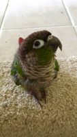 Year and a half old female Greek cheek conure. Currently recovering from a bout of clipping her breast and shoulder feathers, so there is some grey fluff with a few red feathers in her breast, rather than a full coverage. Last seen at the top of a very, very tall tree, seemingly hanging difficulty flying down. Wings are not clipped. She has a band, but I do not have the ID on hand. Will get it from her avian vet, and supply the number for ID.