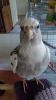 Cockatiel, White face & Silver. He is very sociable will routinely will fly to people and sit on their head or shoulder.