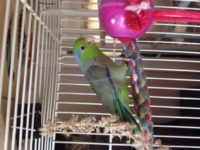 He is a green male parrotlet. He loves pistachios and chicken bones. He says birdie and peeps. He will land on your head or shoulder but never on your finger.
