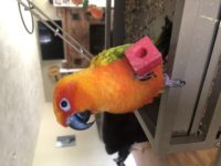 Red, yellow, orange, green, some blue on his tail. He likes to say “pretty bird”, “come here”, and “ I love you”.