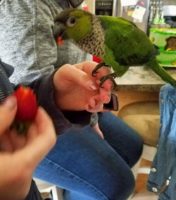 Mostly green small bird. Black on top of her head. Black and white spots on her neck and some red under her wings.