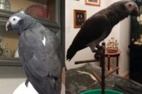 African Grey Timneh Parrot Her name is Tesla about 1 foot / or 13 inches from head to tail Mostly grey with white/ light grey around the eyes on back behind wings and on chest and belly with red on her tail feathers. She has a green Identification band on one of her legs.
